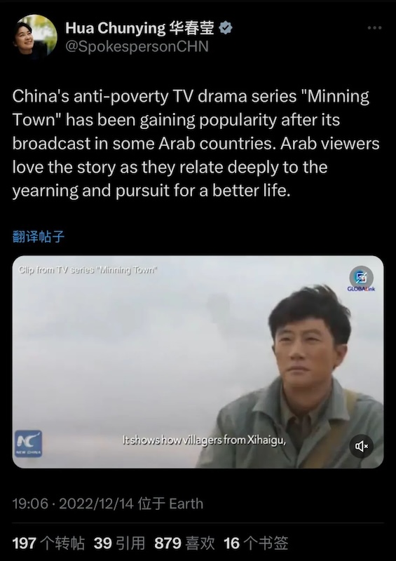 2022年11月以来,中国脱贫攻坚题材电视剧《山海情》阿语版先后在阿联酋、阿尔及利亚、沙特阿拉伯、苏丹、伊拉克、阿曼、埃及、摩洛哥、也门等 10 多个国家主流媒体播出,近30家阿拉伯国家的媒体对该剧播出进行报道?!爸泄銎短獠牡缡泳纭渡胶G椤吩诎⒗恍┕也コ龊笫艿饺扰?。阿拉伯观众喜欢这个故事,因为它与对美好生活的向往和追求有着深刻的联系。”—— 中国外交部党委委员、部长助理华春莹在海外社交媒体平台 Twitter 上的推文