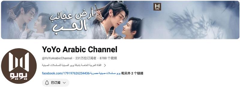 YoYo Arabic Channel于2017年正式运营,首部上线剧集为《双世宠妃》。经过世纪优优专业团队的本地化运营,截至2023年12月已有231万订阅用户,频道累计观看量超10亿次。世纪优优YouTube阿拉伯语频道的设立,不仅在中国与阿拉伯国家之间建立了一座沟通桥梁,更在促进阿语国家民众对中国的了解、增进中阿友谊方面起到了积极作用。
