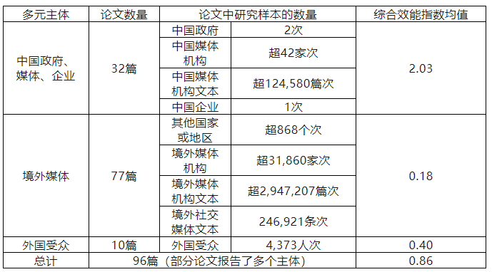 研究结果显示,围绕“一带一路”国际传播效能开展研究的96篇实证论文,既评估了参与“一带一路”国际传播的中国政府、中国媒体和中国企业,还评估了境外媒体机构(及所代表的国家)和境外社交媒体,也调查了他国受众对“一带一路”的认知和评价。多元主体对“一带一路”进行建构的“综合效能指数”均值为0.86(最高分3,表示非常正面;最低分-3,表示非常负面;以下同),说明“一带一路”在国际传播中获得了总体平衡偏正面的全球评价和传播效果(见表1)。