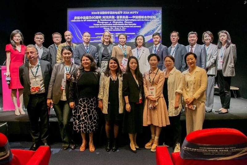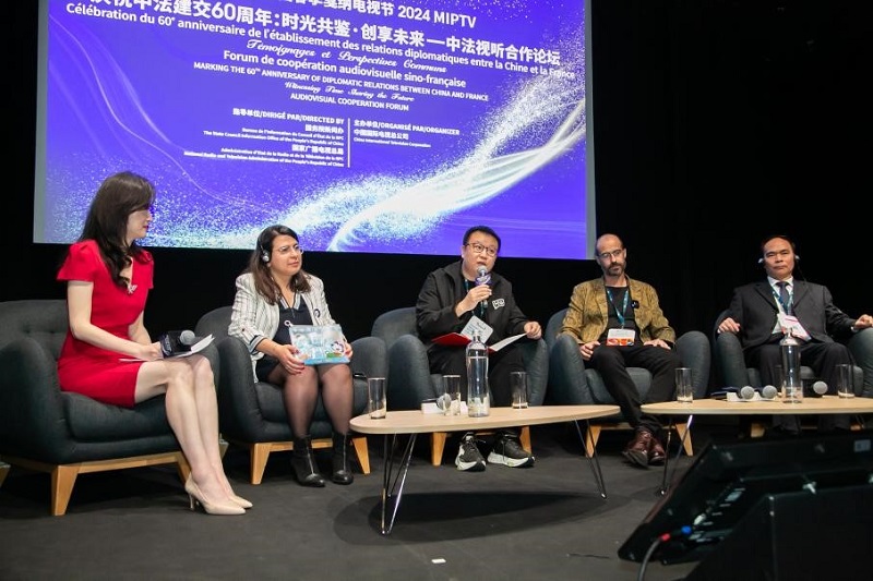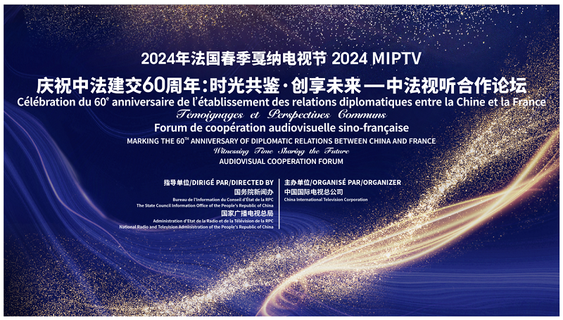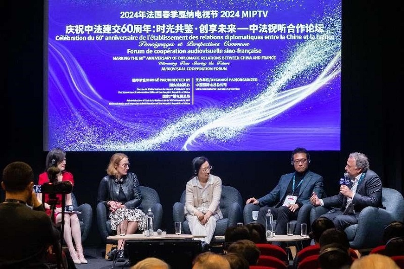 当地时间2024年4月8日,由国务院新闻办、国家广播电视总局指导,中国国际电视总公司主办的法国春季戛纳电视节“中国联合展台”活动正式启动。同日,“庆祝中法建交60周年:时光共鉴·创享未来——中法视听合作论坛”在法国戛纳影节宫举办?!爸泄险固ā币舱接尤蚩突?。来自中央广播电视总台、中国国际电视总公司、各地方局/电视台、企事业单位及中法两国知名媒体机构的120多位嘉宾共同出席活动。论坛现场,各界嘉宾畅谈合作,共谋发展机遇,发布了纪录电影《北京人:人类最后的秘密》、综艺《花儿与少年·丝路季》、动画片《小狼乐宾》等十部各类型题材中法合作合拍精品项目。