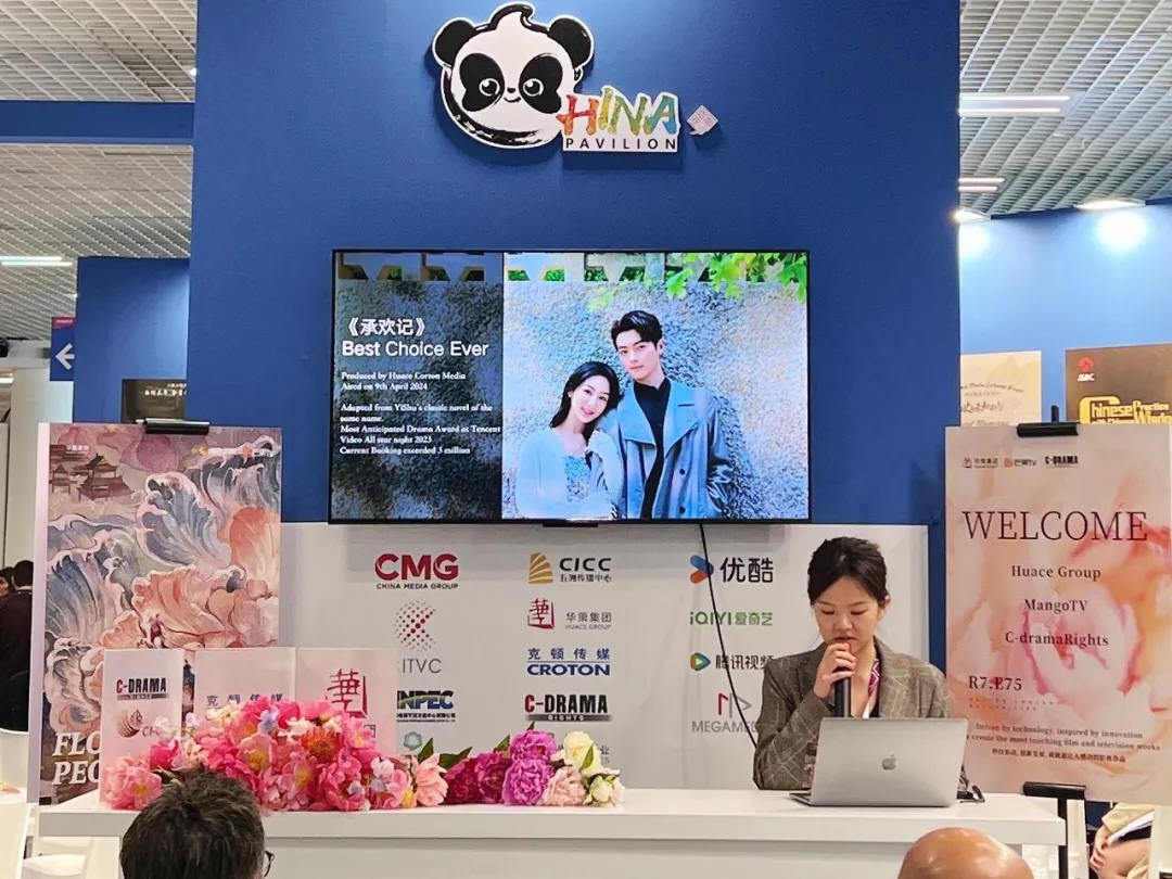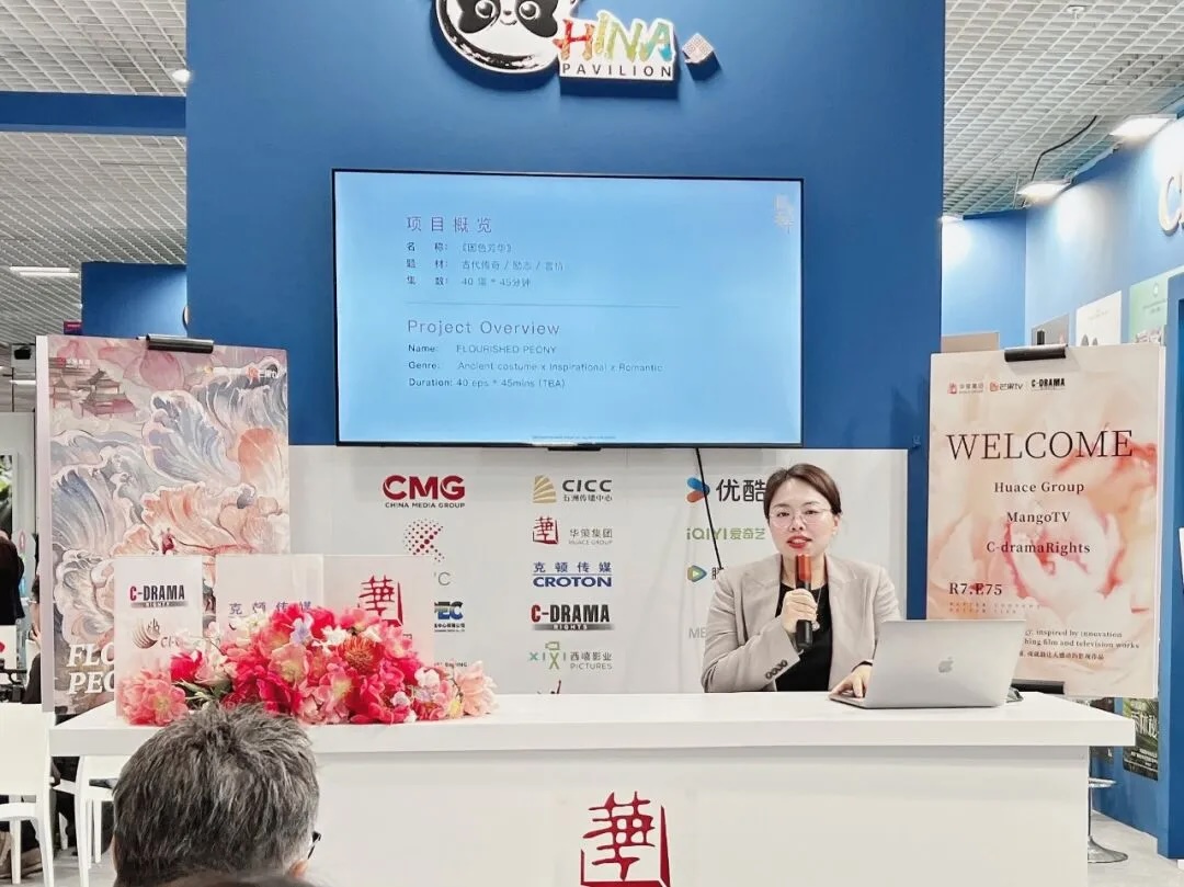 当地时间4月8日下午,华策影视集团在“中国联合展台”举办发布会,面向国际市场重点推介《国色芳华》《承欢记》两部新剧。现场装饰以多种品类的牡丹花,繁花似锦、花团锦簇,将中华独特的牡丹文化向全球推广。