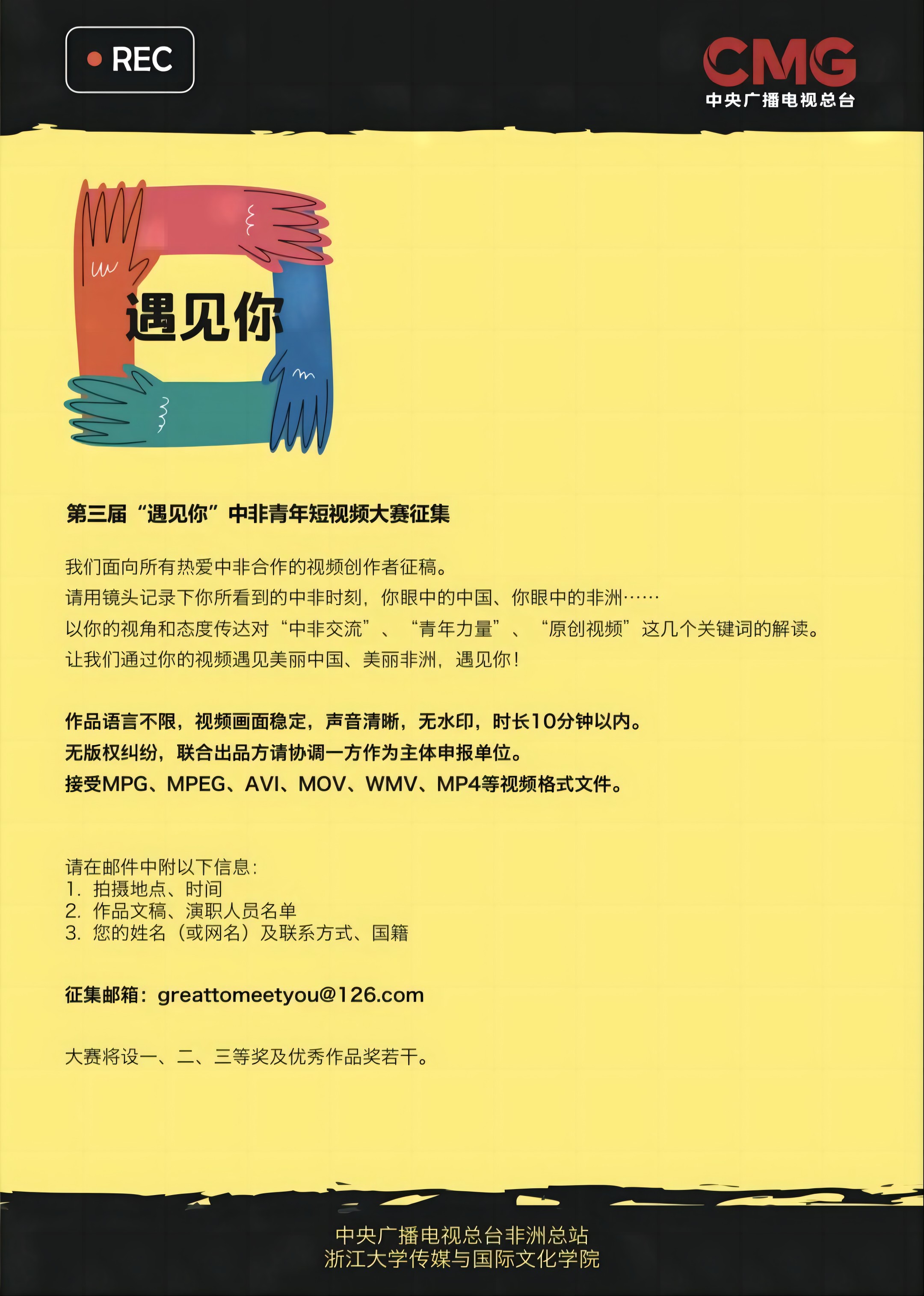 本次大赛由中央广播电视总台非洲总站和浙江大学传媒与国际文化学院联合举办,中非视听工作室策展执行。欢迎各位创作者踊跃参与,让我们通过你的视频遇见美丽中国、美丽非洲,遇见你!