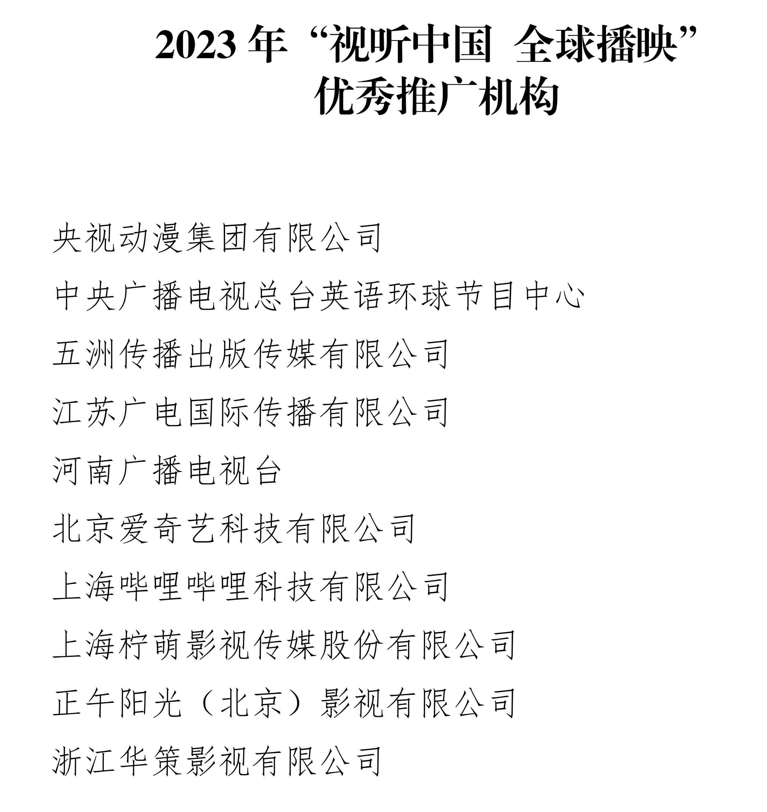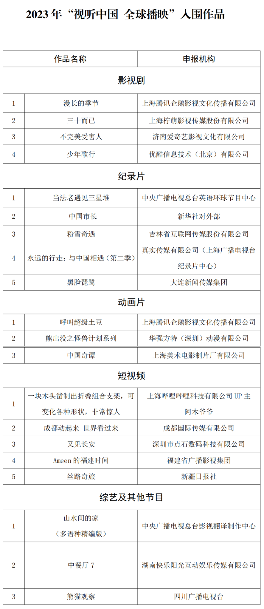 中央宣传部办公厅和国家广播电视总局办公厅于今年5月联合发布2023年“视听中国 全球播映”优秀作品评选工作的通知,按照导向正确、传播效果好、推广活动力度大的评选标准,经专家评审委员会评审评议,最终确定20部优秀作品、20部入围作品和10家优秀推广机构。这是首次以覆盖全品类的方式,隆重发布“视听中国 全球播映”优秀作品、入围作品和优秀推广机构,旨在激励全行业创新突破,推动创造具有国际竞争力的精品内容,提升视听作品的国际传播效能,促进民心相通、文明互鉴。