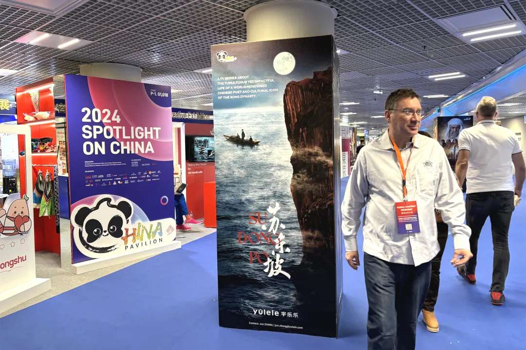 宇乐乐(海南)影视文化选择中国联合展台旁边的立柱广告宣传电视剧《苏东坡》,该剧讲述了中国北宋杰出文学家、书法家、画家苏轼经历丧母、丧妻、丧父、丧子之痛,人生沉浮和仕途迁谪后,始终保有坚韧意志和豁达人生态度,以贤官之身为百姓谋福祉的故事,旨在展现苏轼多才多艺、波澜壮阔、世界闻名的一生。电视剧《苏东坡》的制作和播出,无疑会进一步推动中华文化的国际传播,让世界更好地了解这位北宋文化巨匠,了解他所代表的中华文化的深厚底蕴。通过电视这一媒介,苏东坡的故事和精神,将在全球范围内广泛地被人所熟知,极大地巩固和提高中华文化在世界范围的影响力。