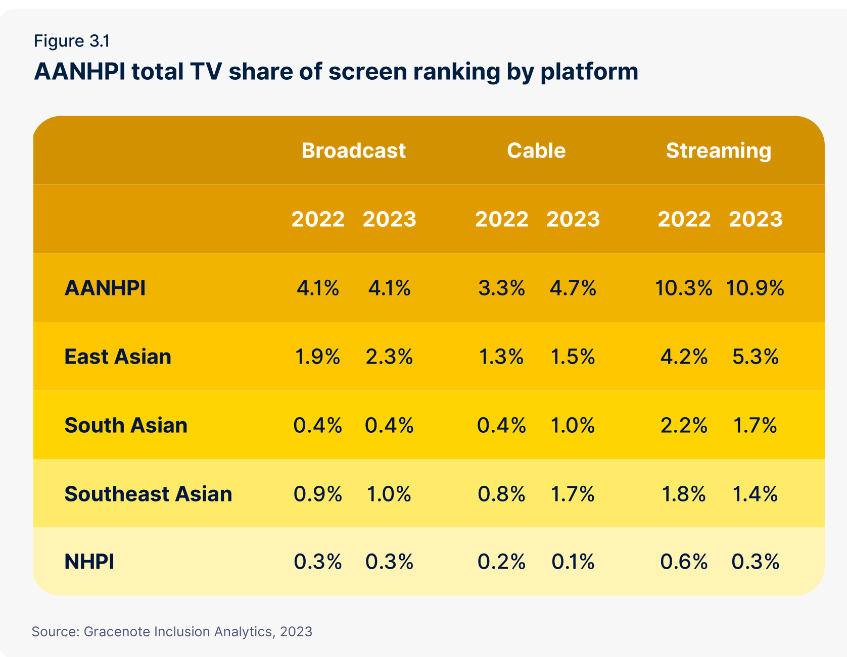 目前,绝大多数此类正面涉及亚裔的内容可以在流媒体平台上找到,其中,体现美国亚裔才华的内容比例,从2022年的10.3%增加到2023年的10.9%。这或许能解释为什么在美国亚裔观众中,流媒体平台在受众观看时间方面超越了广播和有线电视。