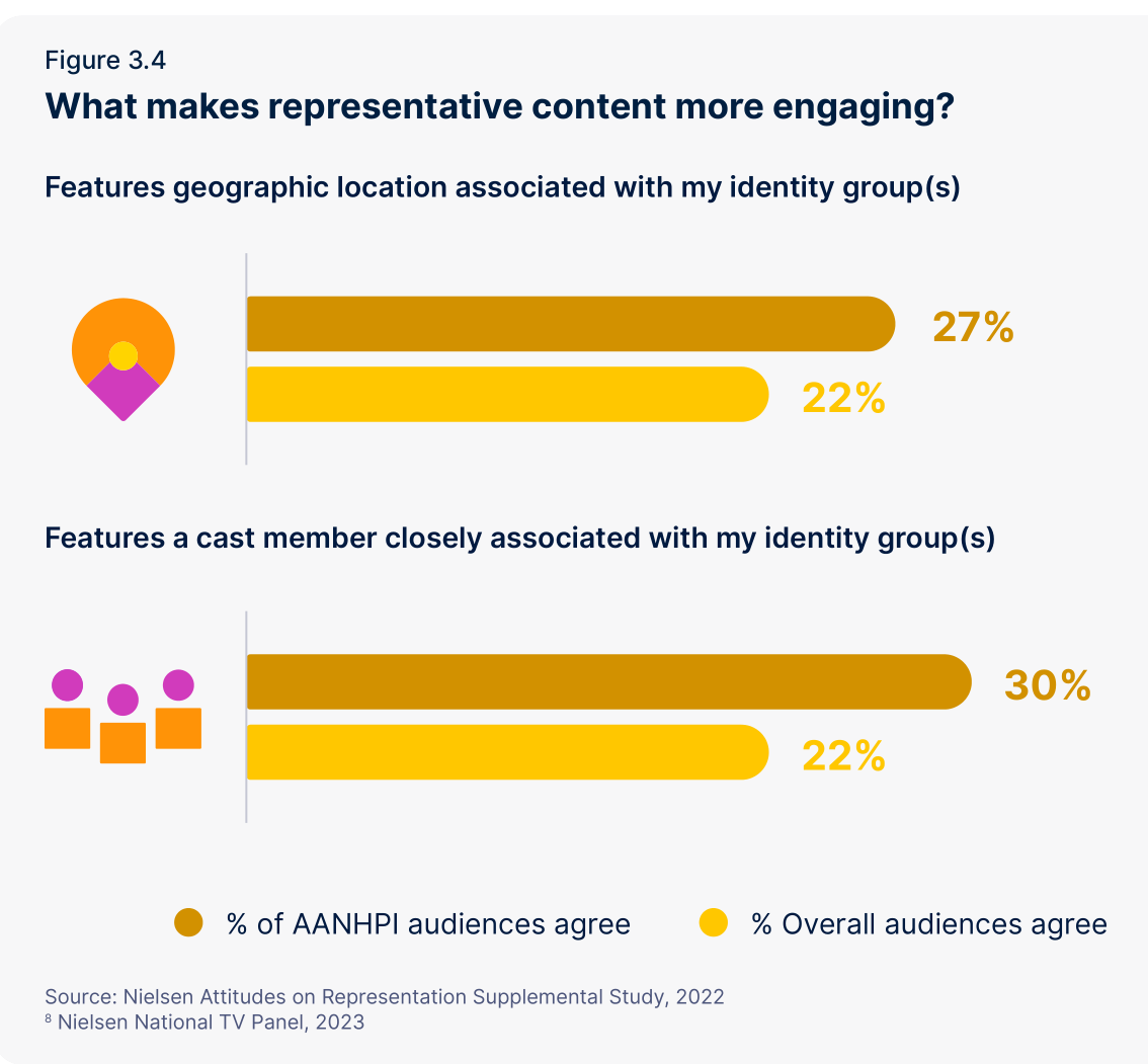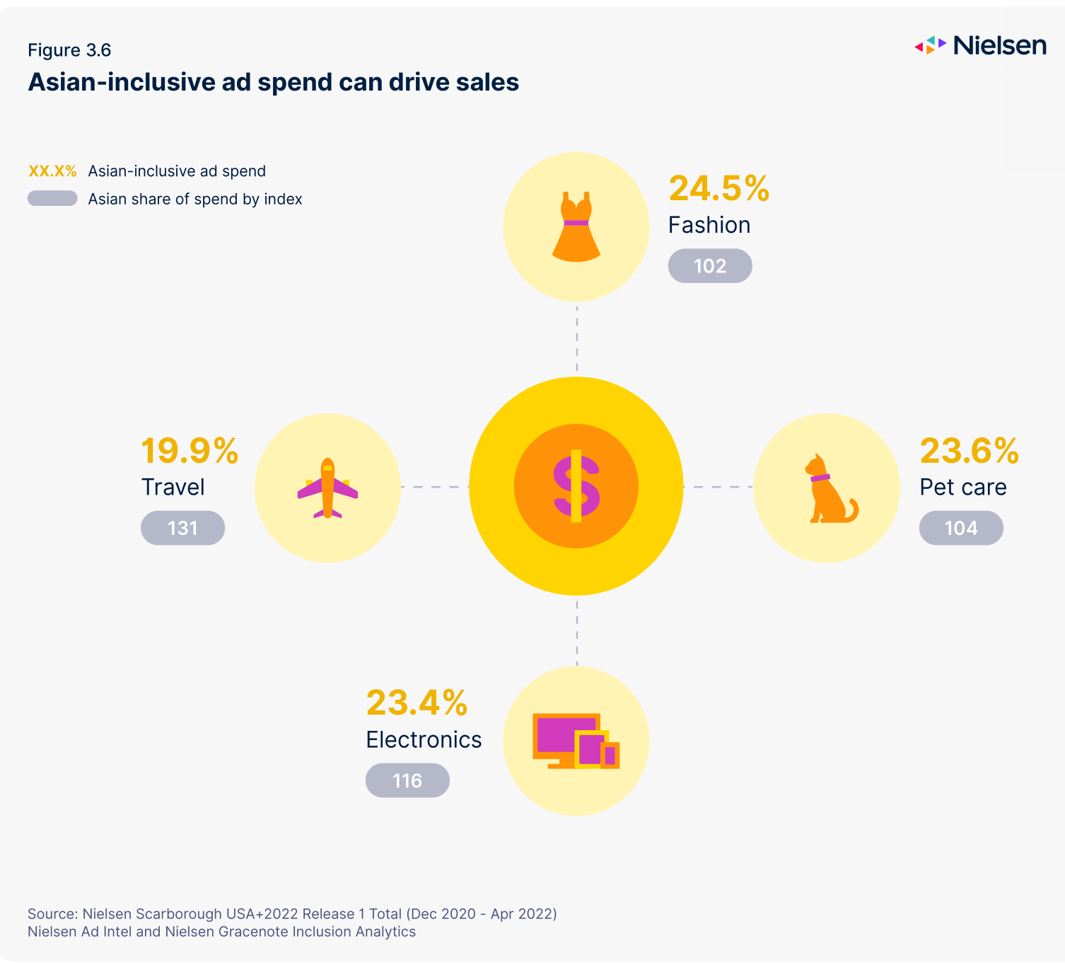 由于美国亚裔观众更倾向于购买那些在正面展示种族形象节目内容中做广告的品牌,因此,广告中融入他们种族身份的元素,可以带来更大的参与机会。2022年尼尔森在对正面展示亚裔形象节目中广告支出的研究发现,某些类别的品牌广告投入高于行业广告平均水平——这些类别也正是亚裔在消费支出上超越其他群体的领域。