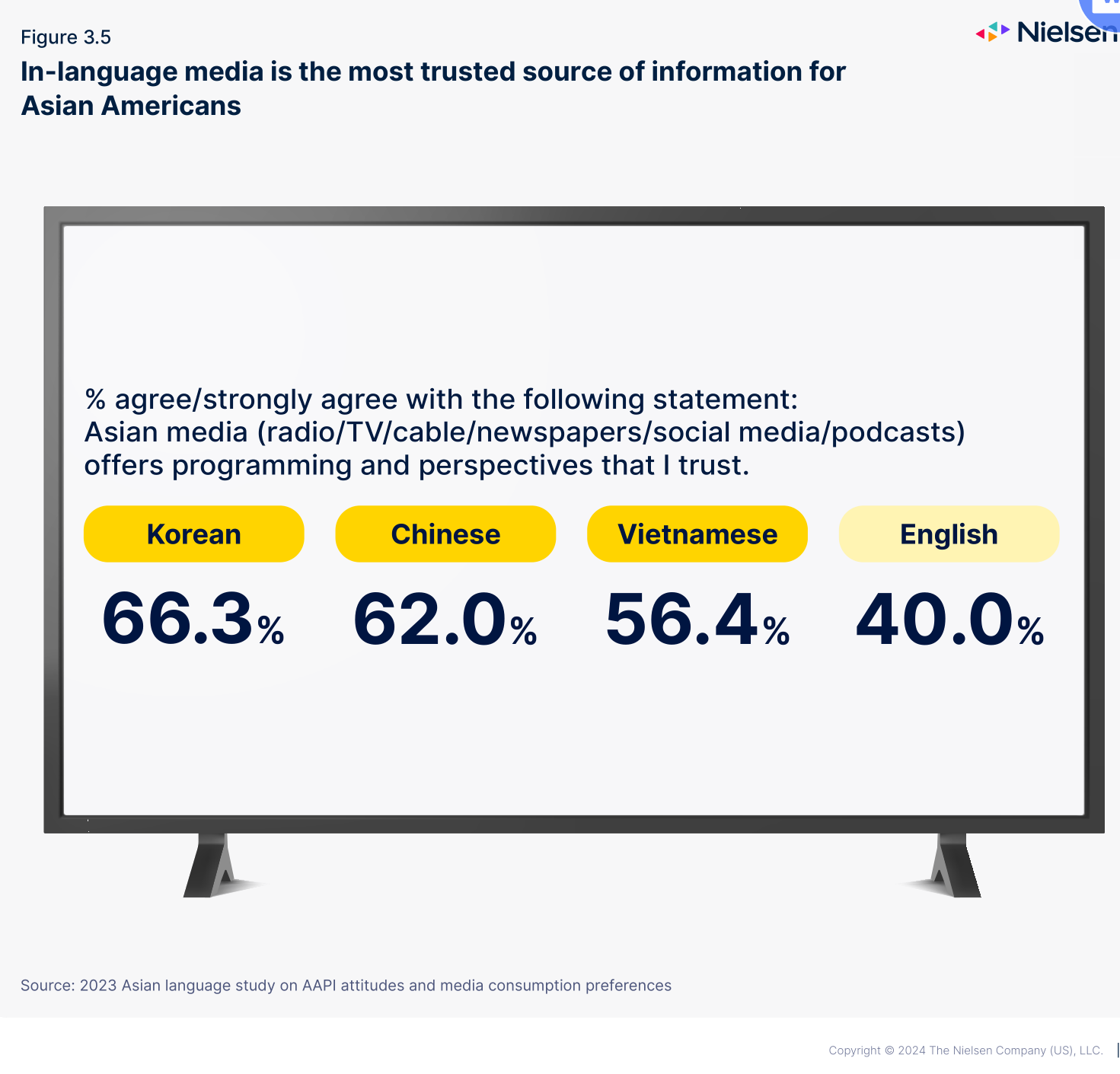 美国的亚裔人口来自20多个国家,讲50多种不同的语言。在2023年一项报告中,尼尔森研究了讲中文、韩语和越南语的亚裔美国人的态度与媒体消费偏好——这三种语言的使用者约占亚裔美国人总人口的40%,且这三种语言是亚裔群体中最常用的家庭语言。