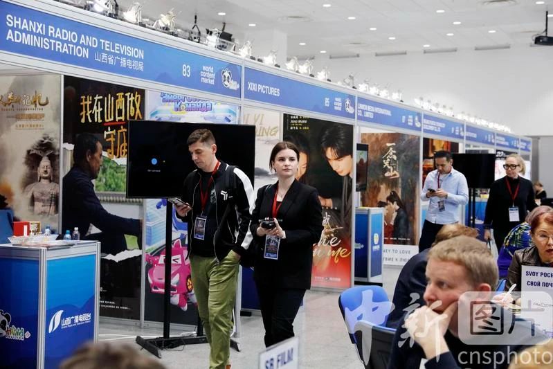 当地时间4月9日,“中国新作品推介会”活动在2025年莫斯科世界内容市场交易展期间举行?!爸泄险固ā本?3部力作,向俄语地区市场进行集中推介。图为交易展上的“中国联合展台”。中新社记者 田冰 摄