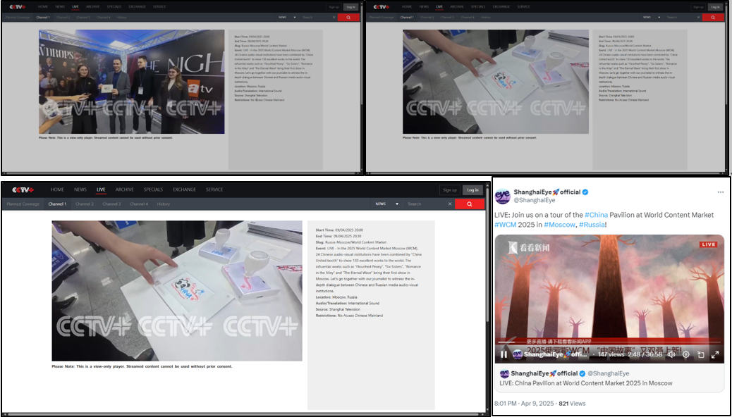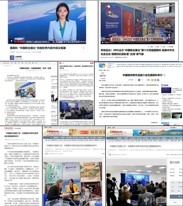 在国内传播方面,2025年莫斯科世界内容市场"中国联合展台"获得了国家级主流媒体的高度关注和广泛报道。中央广播电视总台、人民日报、新华社、中新社、光明日报等中央级媒体,以及国家广播电视总局、上海广播电视台(SMG)、东方卫视等专业媒体机构均对活动进行了报道。其中,CCTV13新闻频道《新闻直播间》和东方卫视《东方新闻》播出的电视新闻专题报道,以及人民网、新华网、中国新闻网等权威网络平台发布的16篇高质量稿件,形成了强大的传播声势。