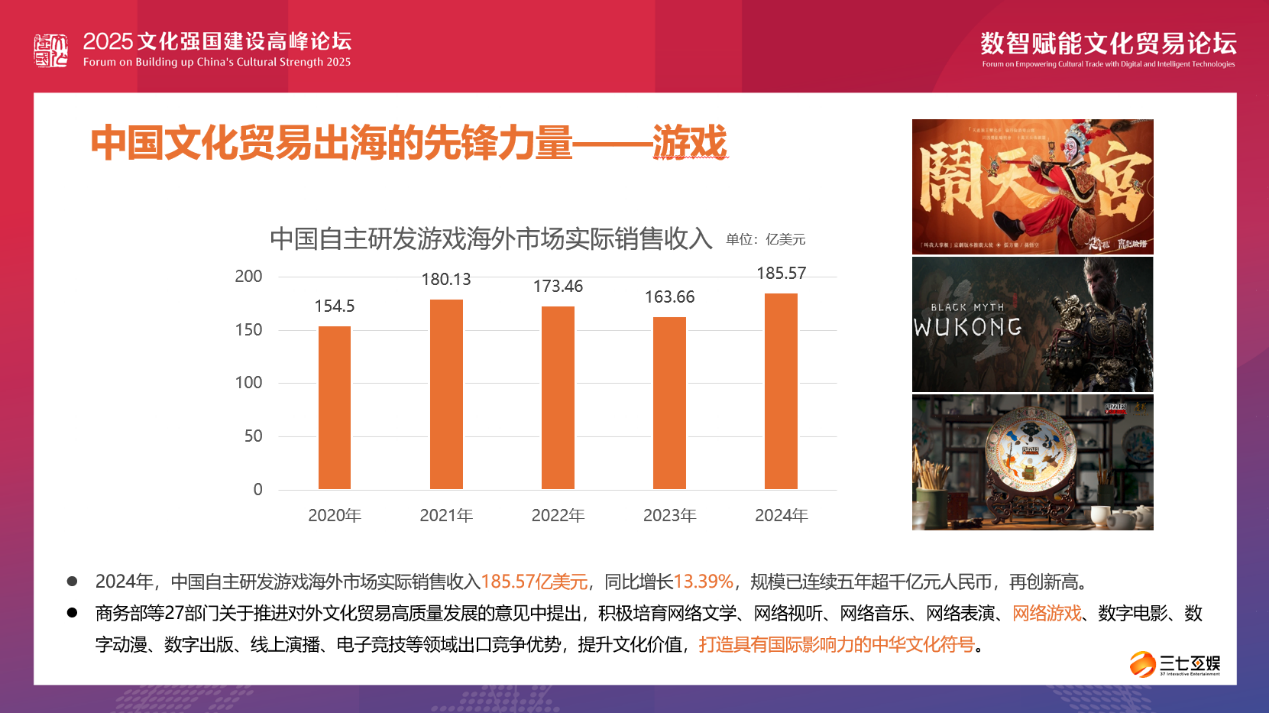 就游戏领域而言,中国自主研发游戏的海外市场实际销售收入持续增长,2024年达到185.57亿美元,同比增长13.39%,规模连续五年超千亿元人民币,再创历史新高。这一数据充分展示了游戏行业在文化出海中的强劲动力。