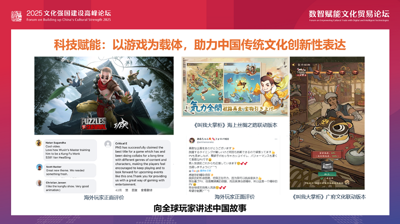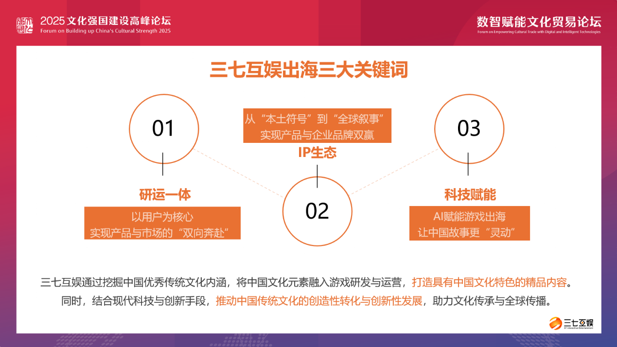 中国文化贸易正经历从 “实体输出” 到 “数字赋能” 的转型。未来,三七互娱将继续以“研运一体、IP生态、科技赋能”为核心,推动游戏与文化的深度融合,助力中华优秀传统文化的全球传播。同时,依托AI、大数据等技术,构建智能化游戏生态,提升研发与运营效率,为玩家创造更具沉浸感与互动性的游戏体验。