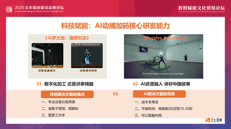 近年来,人工智能快速发展,游戏成为人工智能技术最便捷的应用场景之一。在游戏研发方面,AI动捕技术大大提升了我们的核心研发能力。例如,在《斗罗大陆:魂师对决》中,通过动捕AI技术,通过数字化加工,还原了洪拳精髓,在游戏中呈现出原汁原味的“洪拳配方”;在《Puzzles & Survival》的中国功夫版本中,通过动捕AI技术,严谨还原罗汉棍、七星拳等少林武功。与传统解决方案相比,AI动捕成本更低,节省时间,视频到3D仅需10 - 20秒,而且可以重复利用。