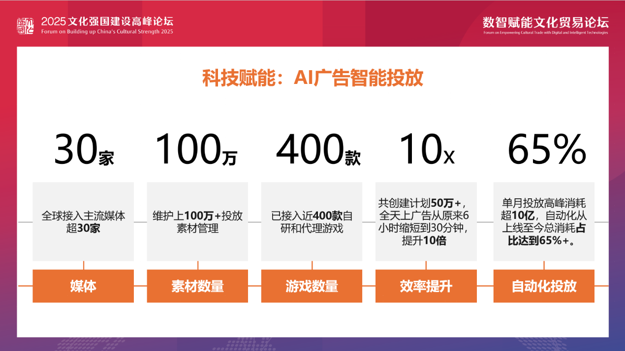 量子广告投放中台更是实现了高效的广告投放。全球接入主流媒体超30家,维护100万 + 投放素材管理,已接入近400款自研和代理游戏。单月投放高峰消耗超10亿,上线至今总消耗占比达到65% +。