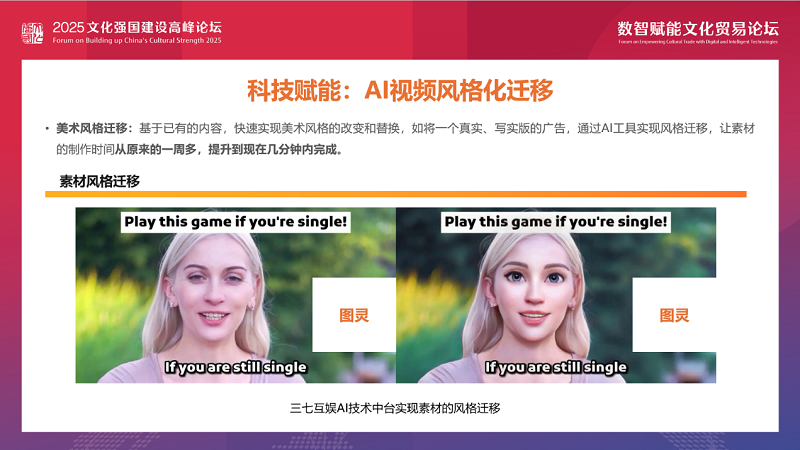 我们的图灵设计中台的AI视频风格化迁移功能,则可以基于已有的内容,快速实现美术风格的改变和替换。原本制作一个真实、写实版的广告素材需要一周多时间,现在通过AI工具,几分钟内就能完成,大大提高了素材制作效率。