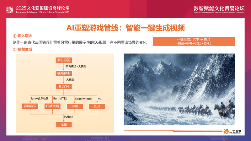 在“AI+游戏”的全新探索中,我们利用AI重塑了游戏开发、发行、运营的各个管线。举个一键生成视频的简单案例:只要在我们的“小七”AI小助手内,简单输入文字指令,1-2分钟内就能自动生成一条具有背景音乐、口播音频、字幕以及画面的视频,时长25秒,除了发出指令,不需要任何人力参与。