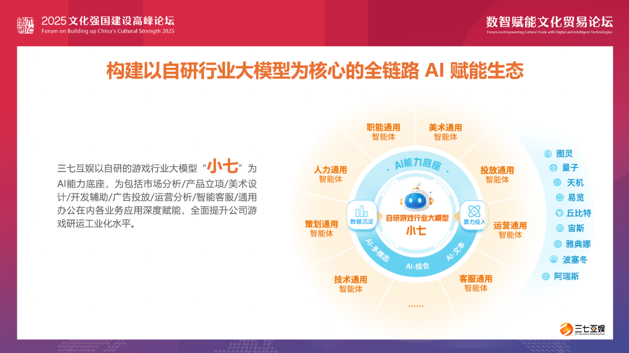 以上案例只是三七互娱在“AI+游戏”领域探索的冰山一角。目前,三七互娱已经成功打造内部游戏行业大模型“小七”,以其为AI能力底座,开发了400多个智能体,覆盖美术、投放、客服、运营、技术等多个维度,为包括市场分析、产品研发、广告投放、运营分析、智能客服、通用办公在内等各业务应用深度赋能,全面提升公司游戏研运工业化水平。